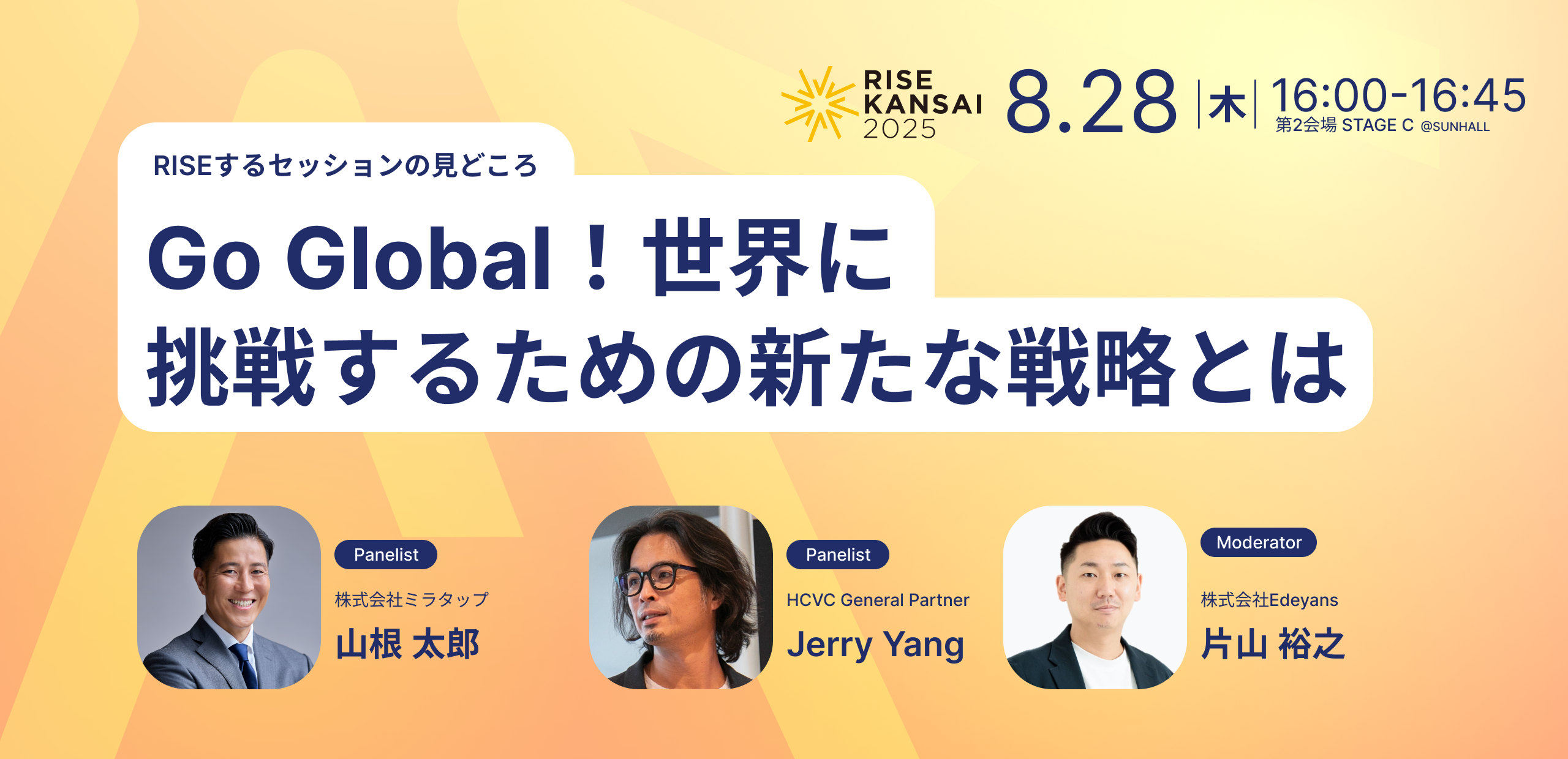 16時からのセッション「アジア市場に挑むリアルな海外戦略」では、株式会社ミラタップ代表取締役 山根太郎氏と 株式会社Edeyans 片山裕之氏が、海外進出の現場で得た成功と失敗の経験を共有します。