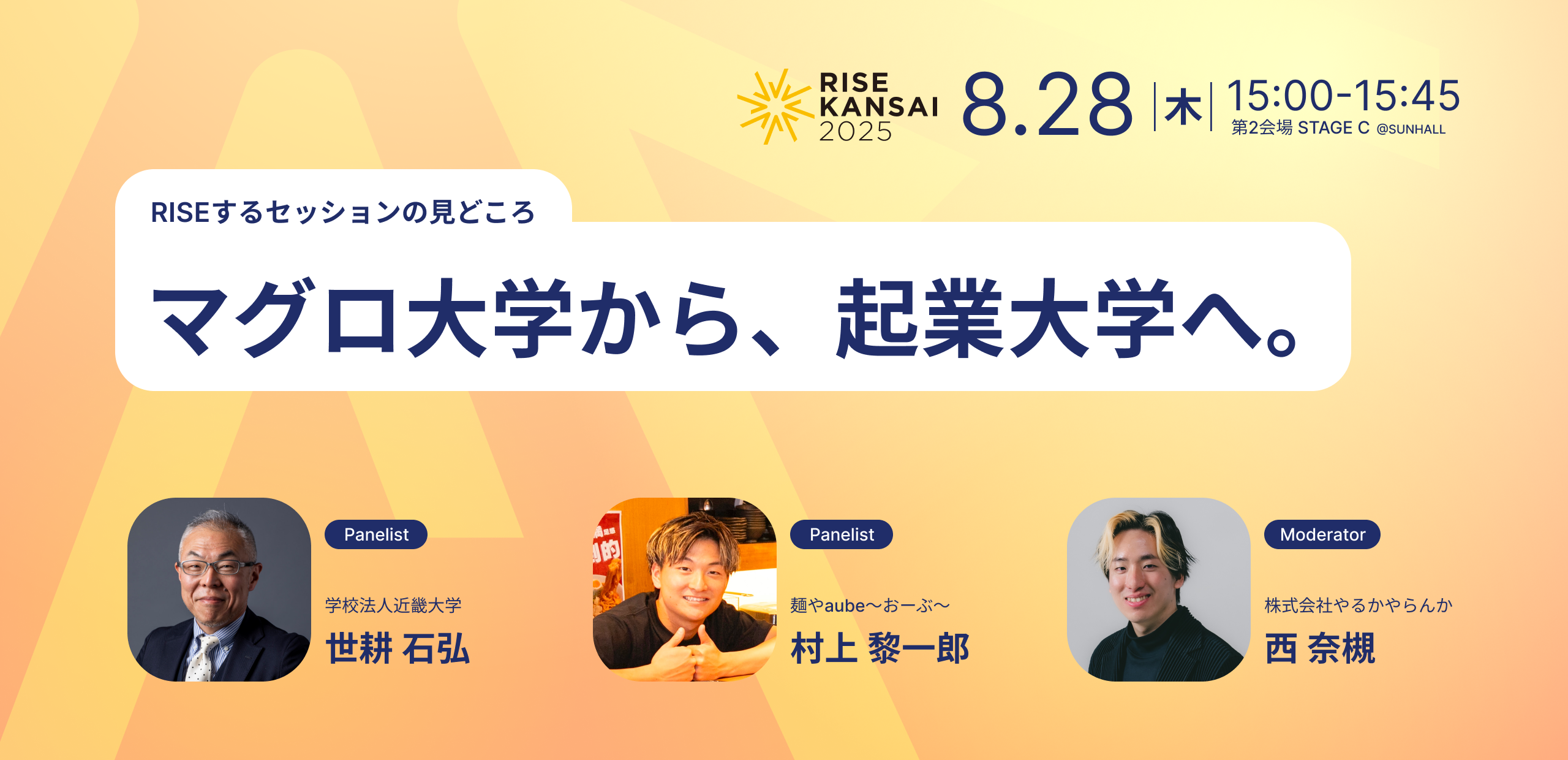 本セッションでは、実際に近畿大学から起業した2名の若手経営者も登壇。成功や課題のリアルを交えながら、「マグロ大学」が「起業大学」へと進化する姿を具体的に描き出します。